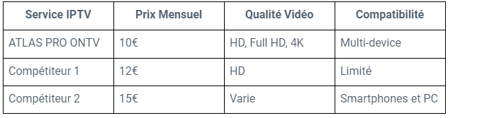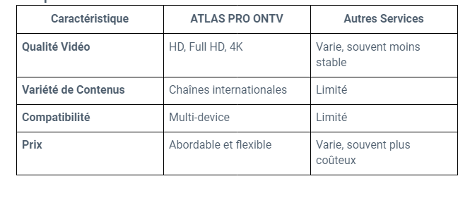ATLAS PRO ONTV surpasse de nombreux autres services en offrant un équilibre de qualité, variété, et coût, ce qui en fait un choix solide pour les utilisateurs IPTV en France.