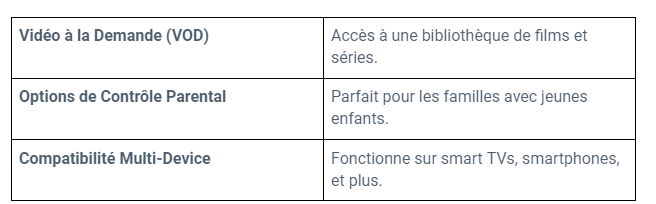 Flexibilité et portabilité : Les utilisateurs peuvent regarder leurs émissions et films préférés depuis plusieurs appareils, incluant les téléviseurs intelligents, smartphones, tablettes et ordinateurs.