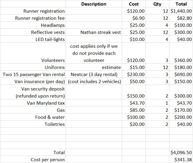 Because this is a 24 hour race, some of the ladies will be running at night. Therefore we are required to have certain safety items like headlamps. Two vans are also needed to transport the team between each exchange point. We will also need water, food and toiletries so we can stay as comfortable as possible in between each sweaty run. : )
