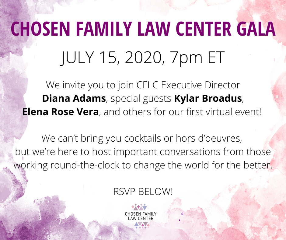 This event will feature Chosen Family Law Center Executive Director Diana Adams, Senior Legal Director Andy Izenson, Trans People of Color Coalition founder Kylar Broadus, Trans Lifeline Executive Director Elena Rose Vera, and other special guests. Learn about the work CFLC is doing to make a life-saving impact for low-income LGBTQIA clients & how you can be a part of that positive change.