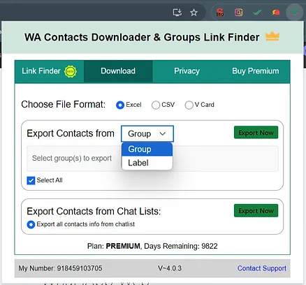 Follow the prompts to export the contacts from the group. You can choose to export them in CSV/ Excel/Vcard format. Select the group/label chat from which you want to extract contacts and hit export.