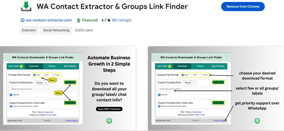 Simplify your contact management using the WA Contact Extractor. This tool allows you to easily export WhatsApp group contacts and ensures a hassle-free experience. It’s intuitive interface also helps you quickly copy WhatsApp group contacts, making it ideal for both personal and professional use. Check out WhatsApp Group Number Finder tutorial on youtube to make the best use of this extension.