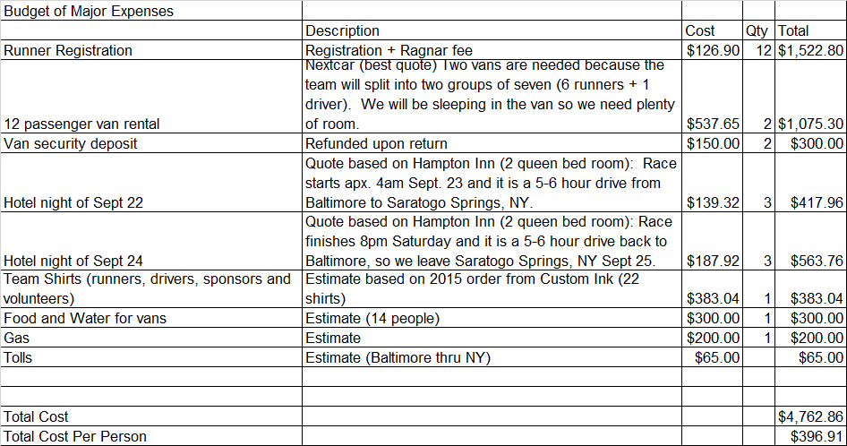 Hotel, Van rentals, Gas, Tolls, Food, Race shirts